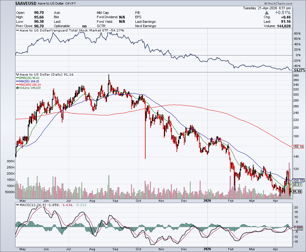 In de onderstaande grafiek zien we het koersverloop van Aave: