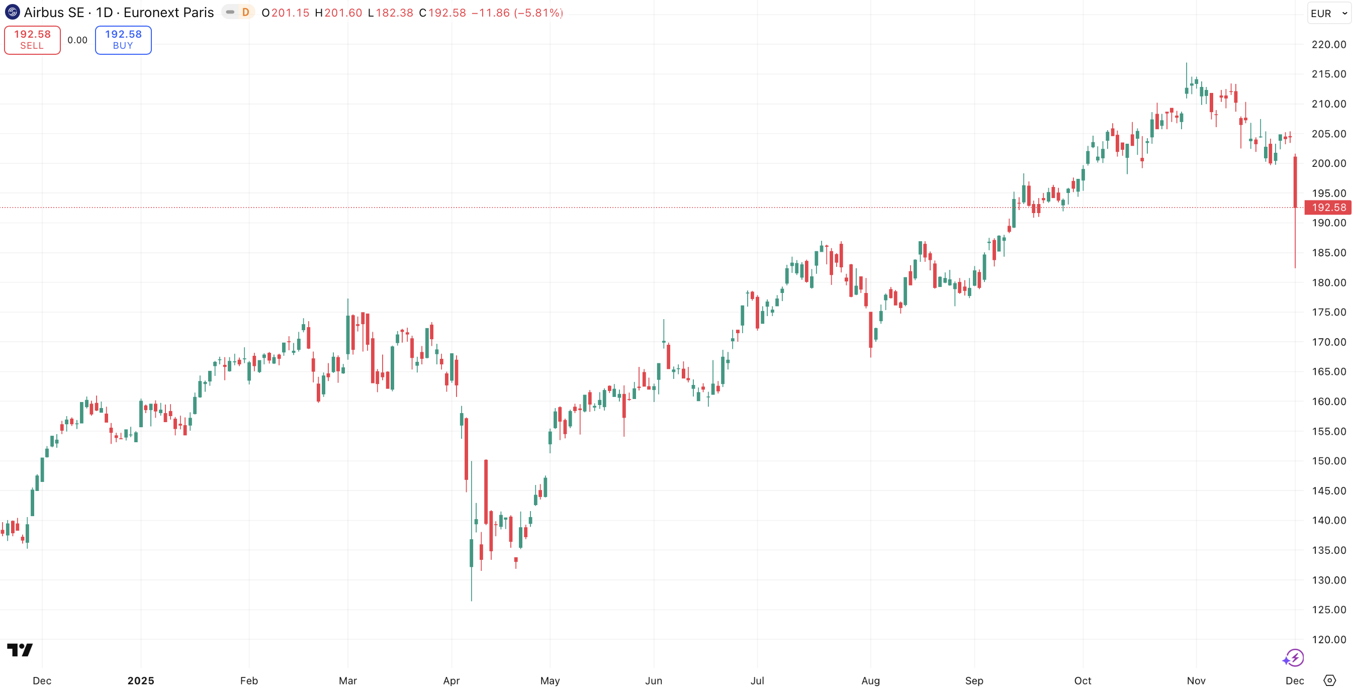 De aandelen van Airbus daalden maandag tot 10% na de melding van het kwaliteitsprobleem. Het aandeel stond tijdelijk onderaan de Stoxx 600-index en sloot preliminair 5,8% lager.