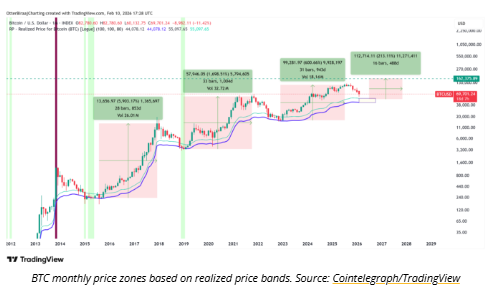 Historische patronen laten zien dat rallies na het testen van deze zones vaak winsten van 170% tot 220% opleverden, met koersdoelen boven $150.000 in een volgende bullmarkt.