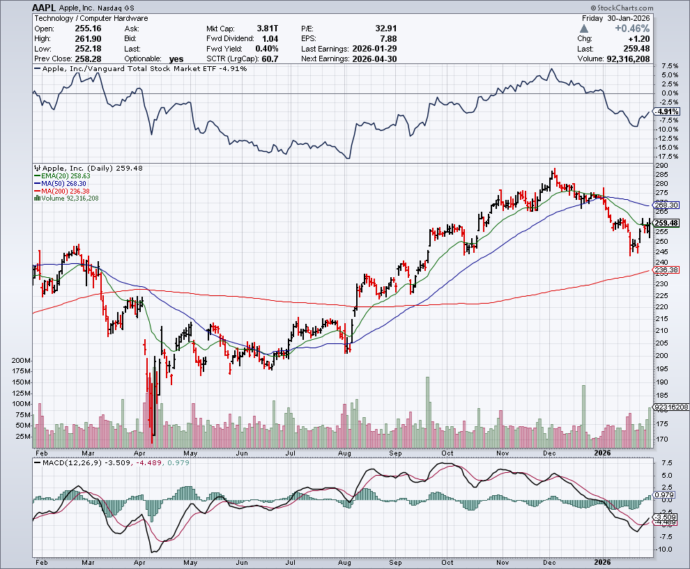 In de onderstaande grafiek zien we het koersverloop van Apple: