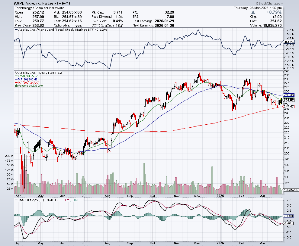 De uitbreiding maakt deel uit van een bredere investeringsbelofte van $600 miljard. In de onderstaande grafiek zien we het koersverloop van Apple: