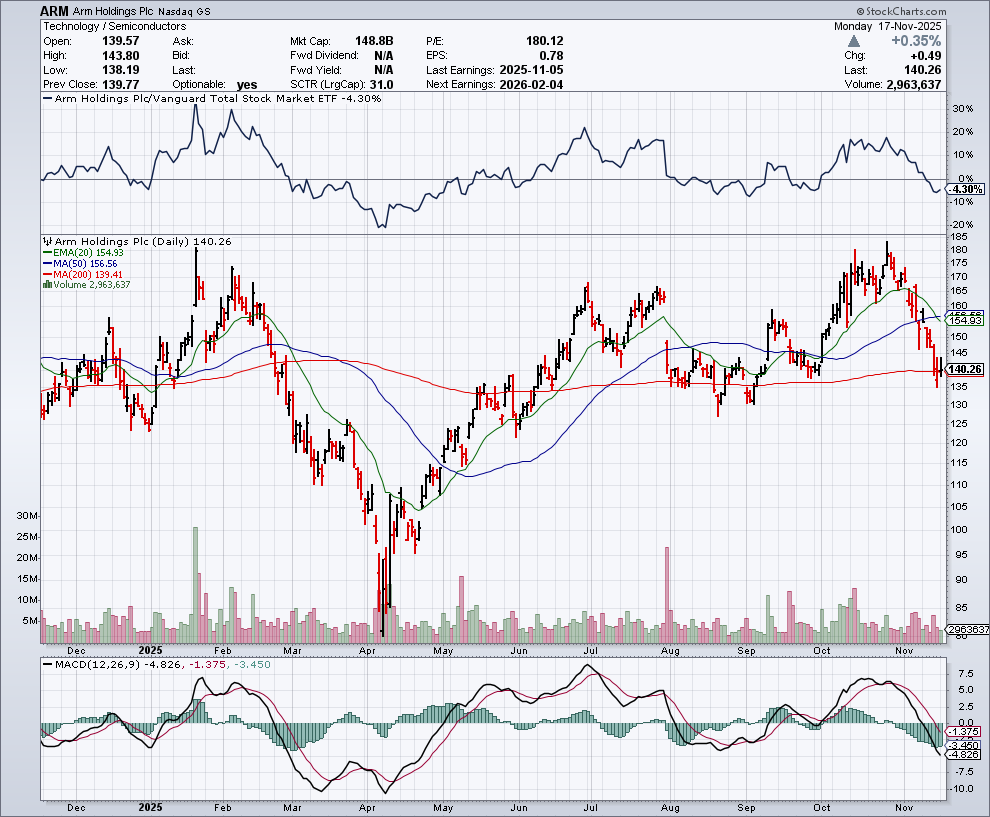 In de onderstaande grafiek zien we het koersverloop van Arm: