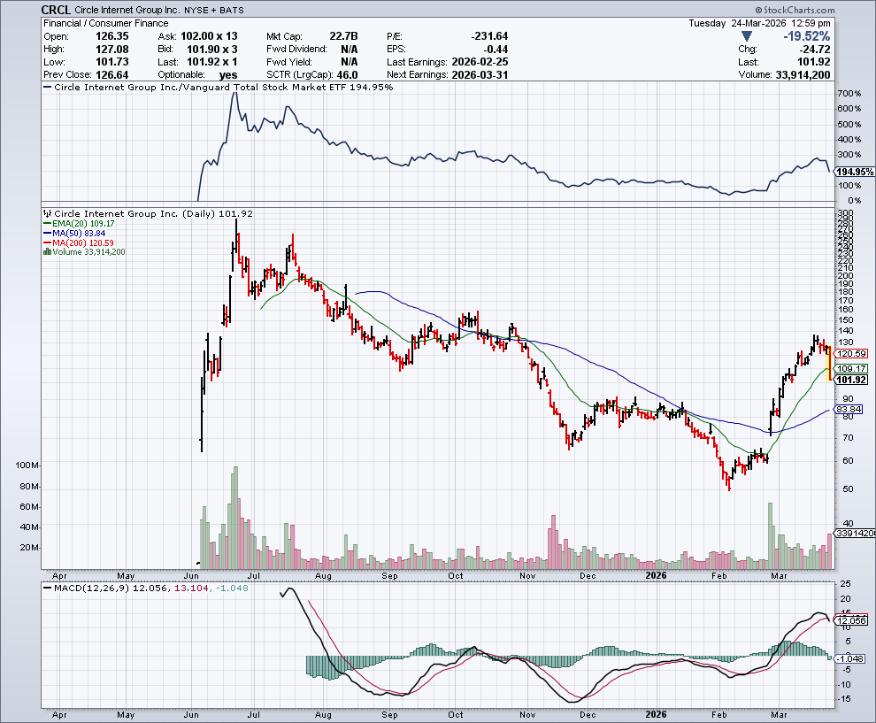 In de onderstaande grafiek zien we het koersverloop van Circle: