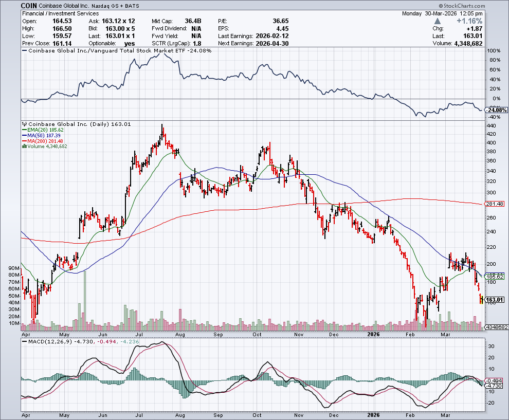 In de onderstaande grafiek zien we het koersverloop van Coinbase: