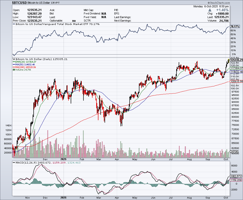 De nieuwe all-time high volgt op de vorige piek van $124.290 in augustus en benadrukt historische oktober-rendementen van Bitcoin. In de onderstaande grafiek zien we het koersverloop van Bitcoin: