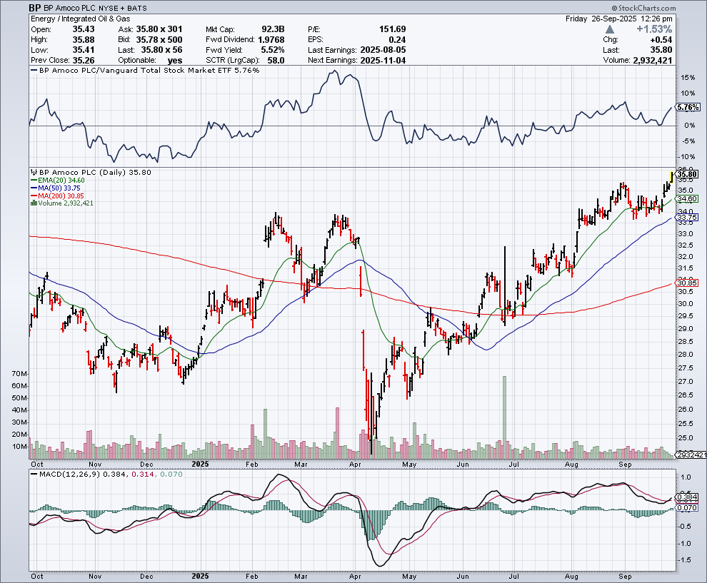 BP’s aandeel steeg sinds april mede dankzij een strategische reset en leiderschapswissel. Albert Manifold werd in juli aangekondigd als nieuwe voorzitter en treedt officieel aan op 1 oktober. Zijn eerdere ervaring met turnaround-projecten wordt als positief gezien.