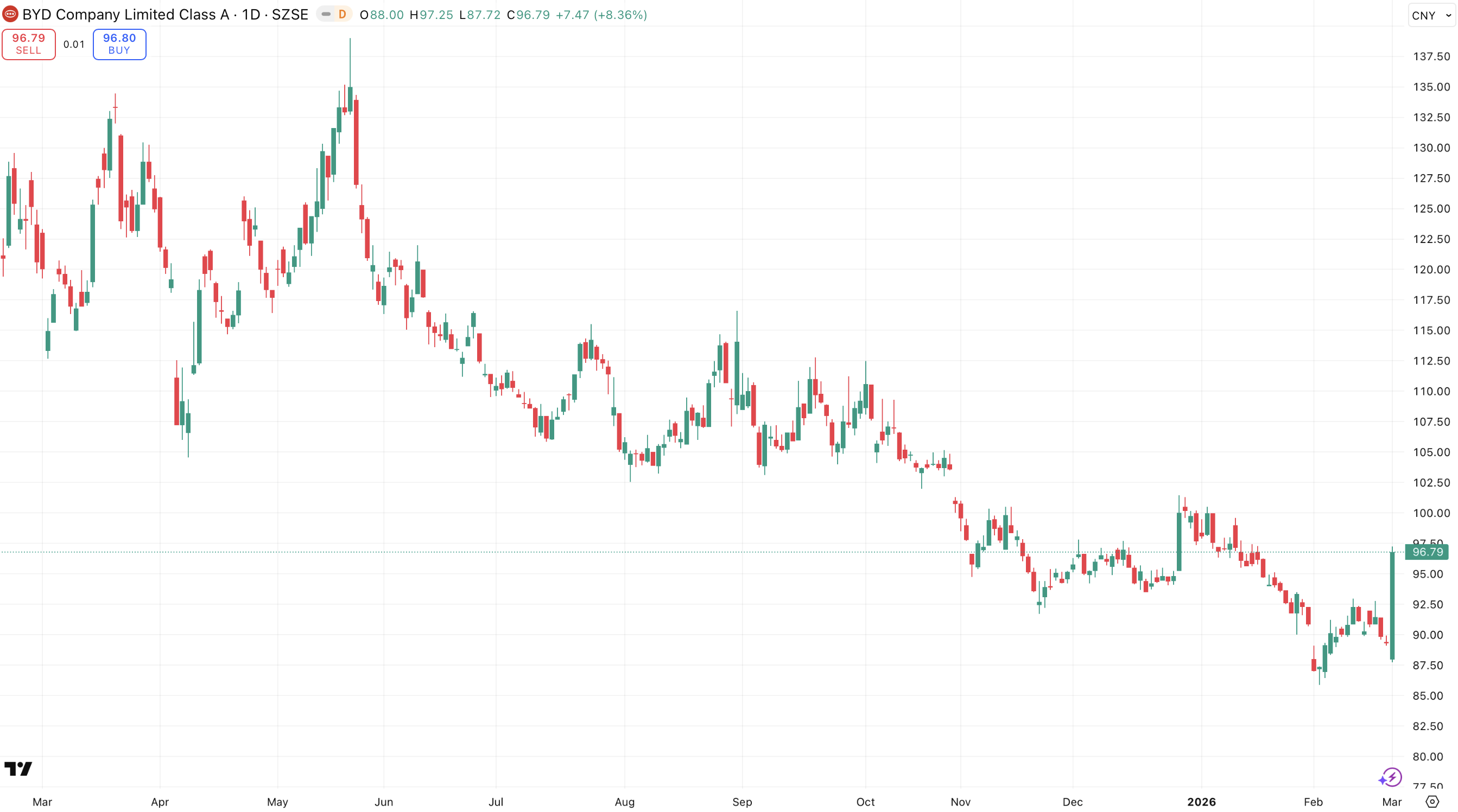 In de onderstaande grafiek is het koersverloop van BYD weergegeven, dat ondanks de verkoopdaling flink steeg:
