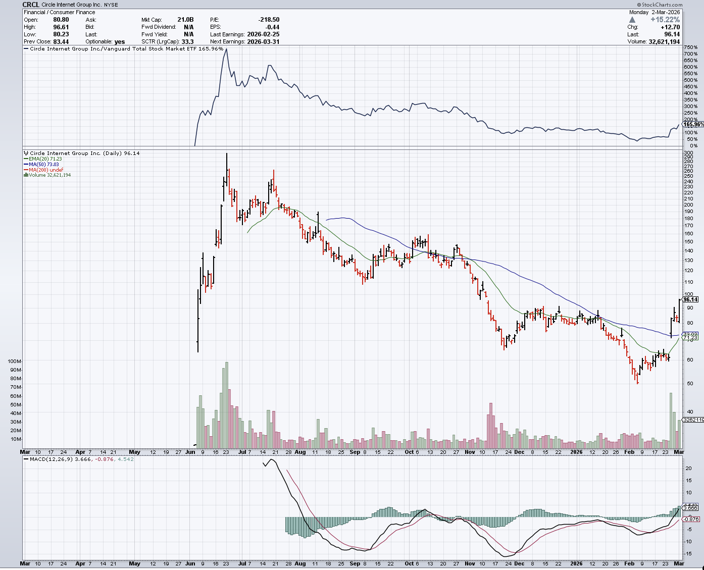 Circle zag de aandelen stijgen tot boven $90 na een beter dan verwachte kwartaalrapportage. De groei wordt gedreven door een uitbreiding van de infrastructuuractiviteiten en een hogere marge bovenop de traditionele reserve-inkomsten. De koers stabiliseerde rond $87, na een stijging van circa 30% sinds de kwartaalcijfers.
