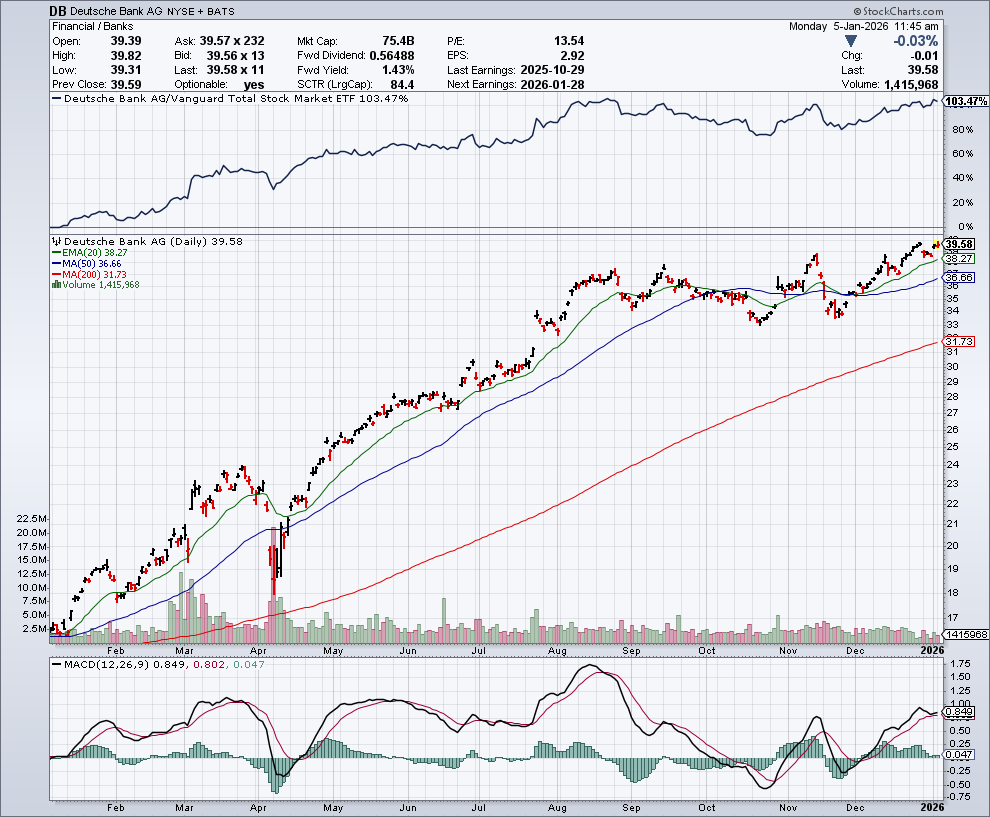Deutsche Bank blijft achter bij Europese concurrenten zoals UniCredit en BNP Paribas wat totaalrendementen betreft.