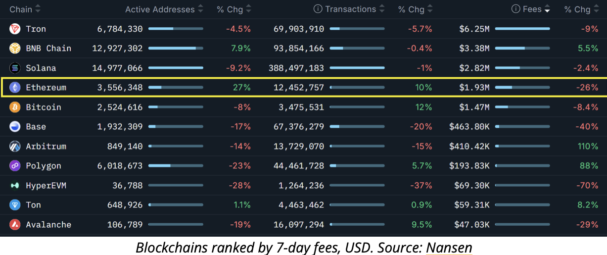 Ethereum-transacties stegen de afgelopen week met 10%, maar netwerkfees daalden met 26%. Dit wijst op beperkte vraag naar blockchainverwerking en DApps.