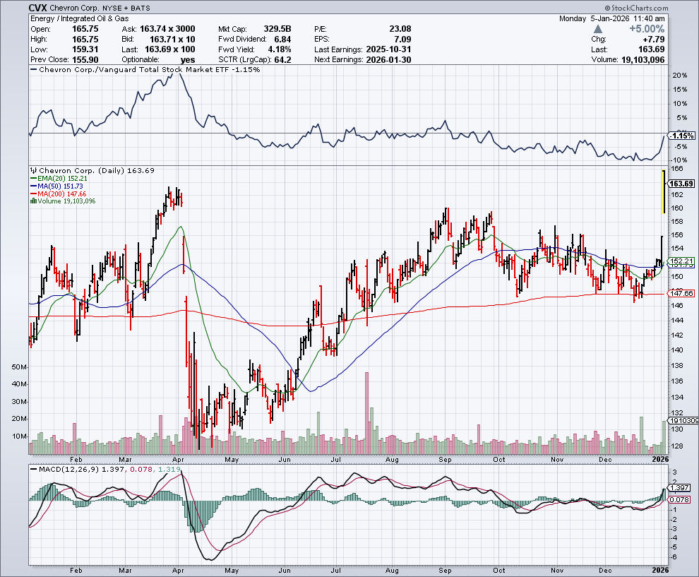 In de onderstaande grafiek zien we het koersverloop van Chevron: