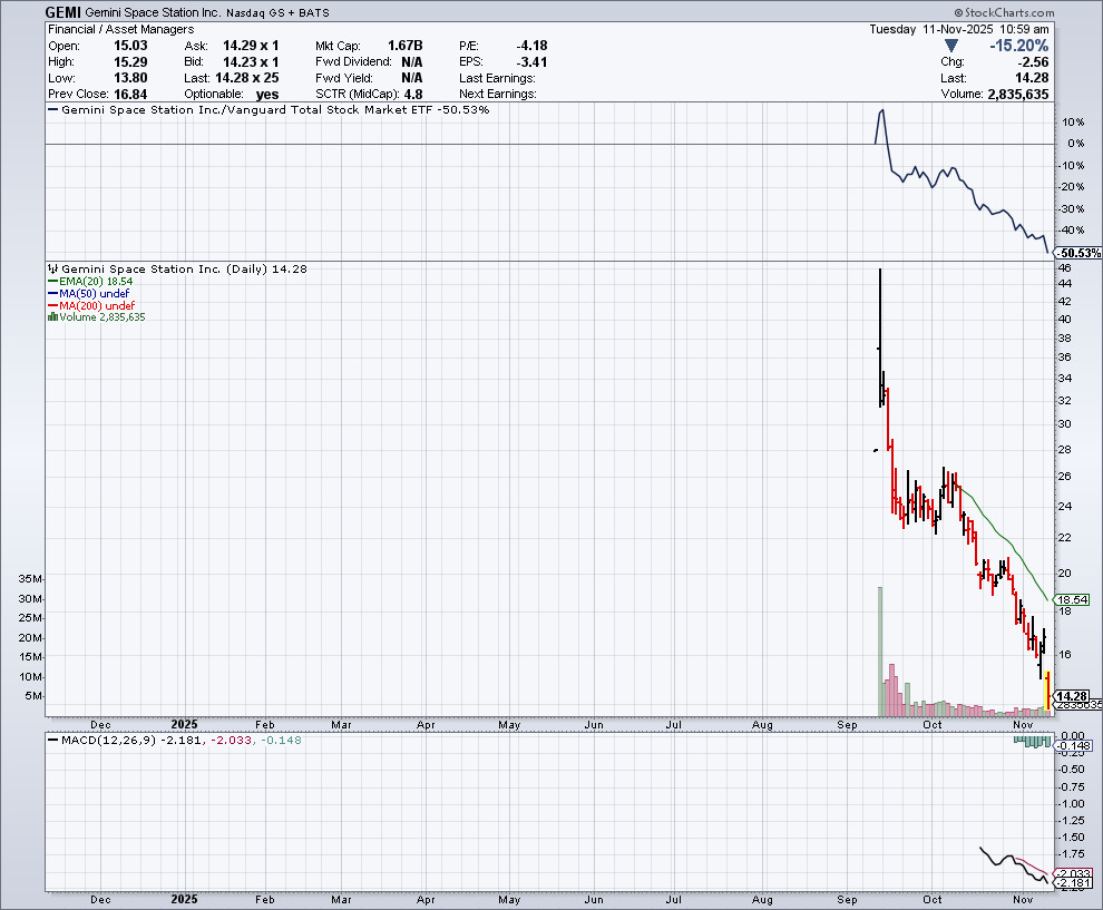 In de onderstaande grafiek zien we het koersverloop van Gemini: