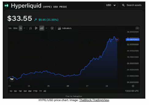Blockchain-data tonen dat grote investeerders HYPE actief opkopen. Een nieuw aangemaakte wallet verplaatste $45 miljoen USDC van Binance naar Hyperliquid en kocht bijna 290.000 HYPE-tokens, ter waarde van ongeveer $9,8 miljoen.