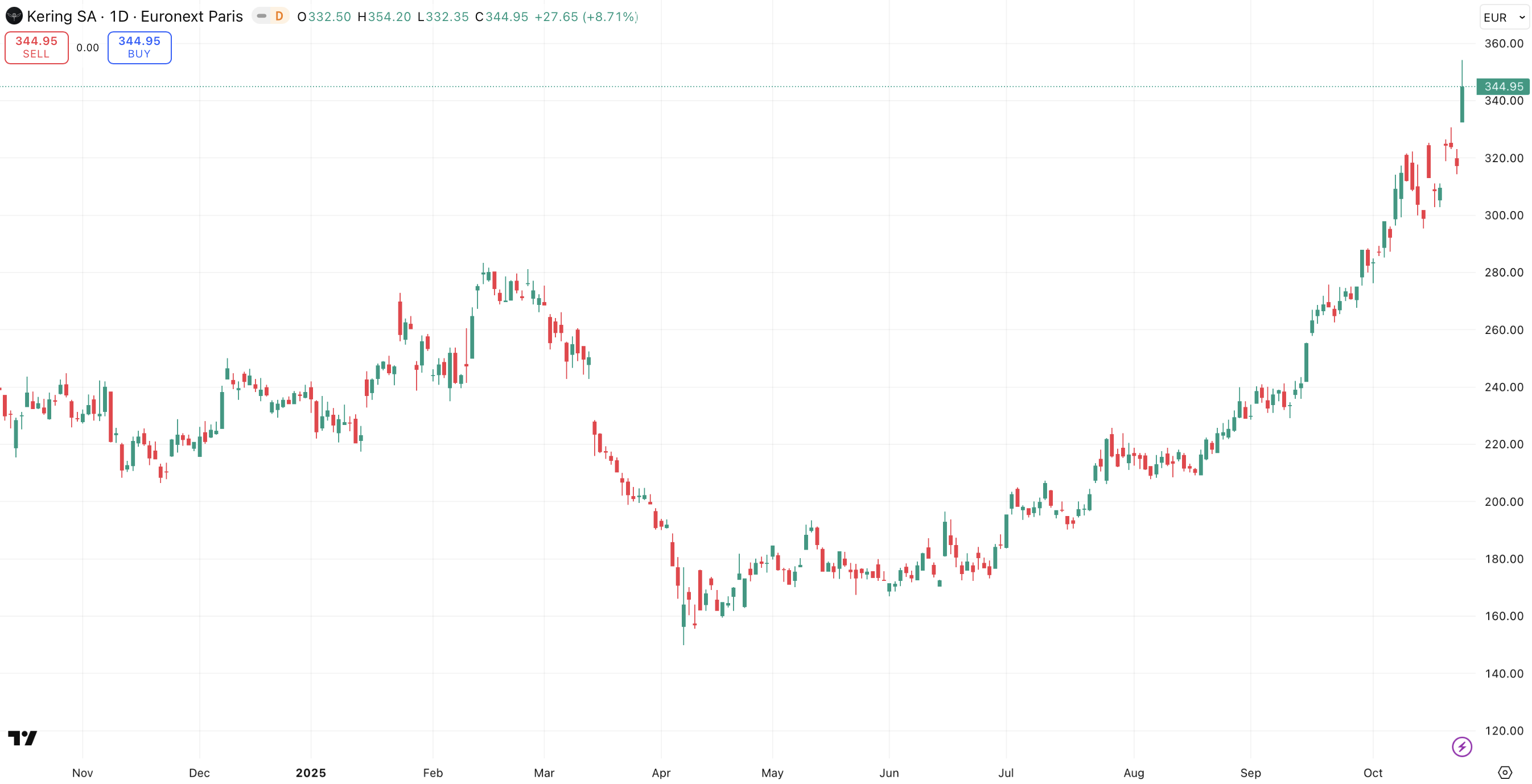 Kering-aandelen stegen naar een 1-jaars hoogtepunt na kwartaalcijfers die beter waren dan verwacht, vooral dankzij verbeterde prestaties bij Gucci. Het Franse luxebedrijf blijft werken aan een herstructurering, waaronder de verkoop van de beautydivisie aan L’Oréal voor 4,7 miljard dollar. De positieve omzetcijfers en marktreactie versterken het vertrouwen van beleggers in een succesvolle turnaround.