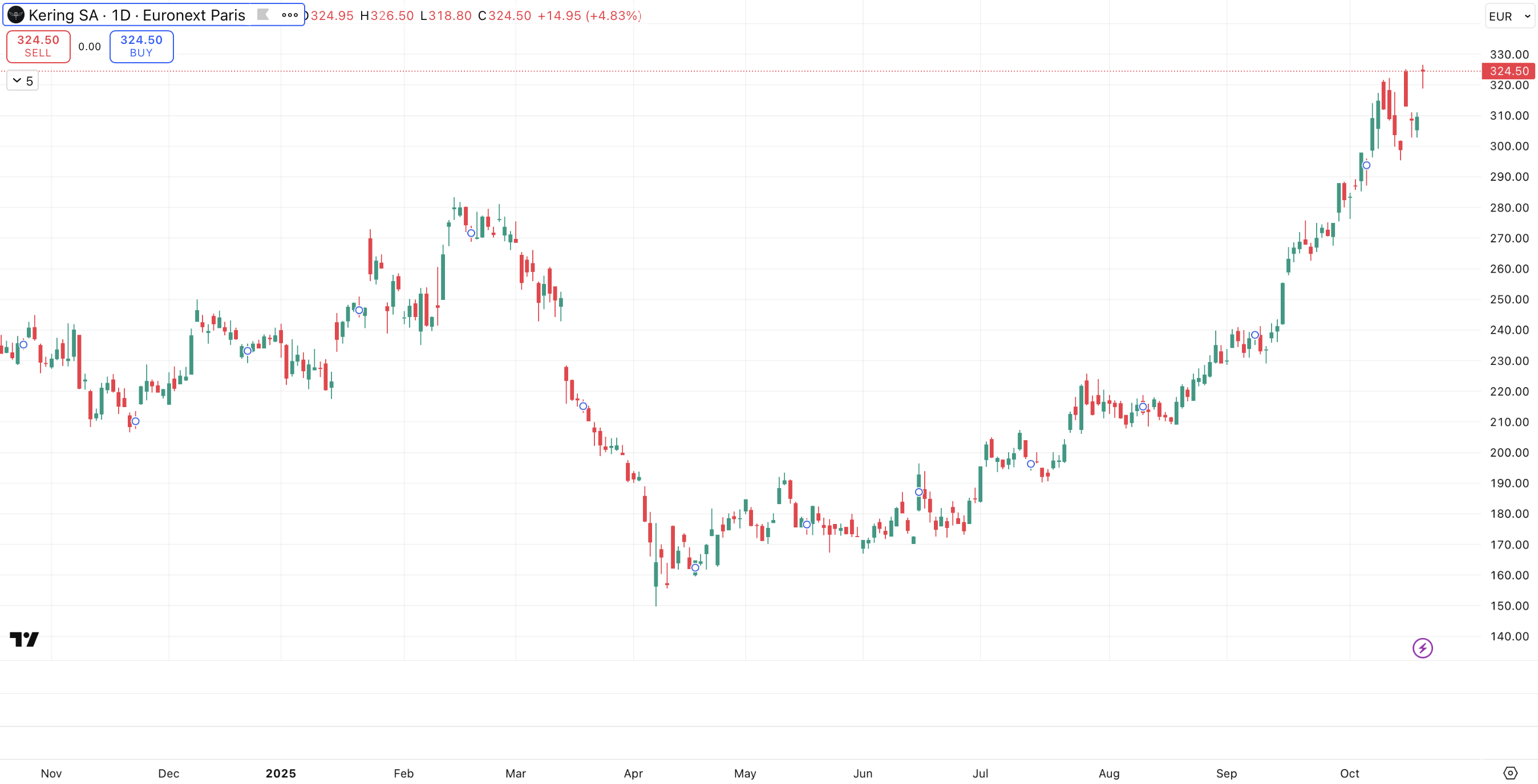 In de onderstaande grafiek is het koersverloop van Kering weergegeven: