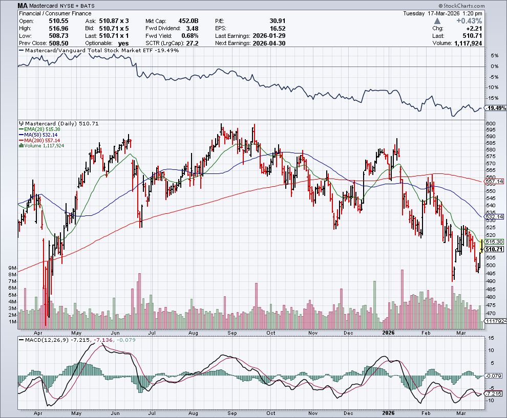 In de onderstaande grafiek zien we het koersverloop van Mastercard: