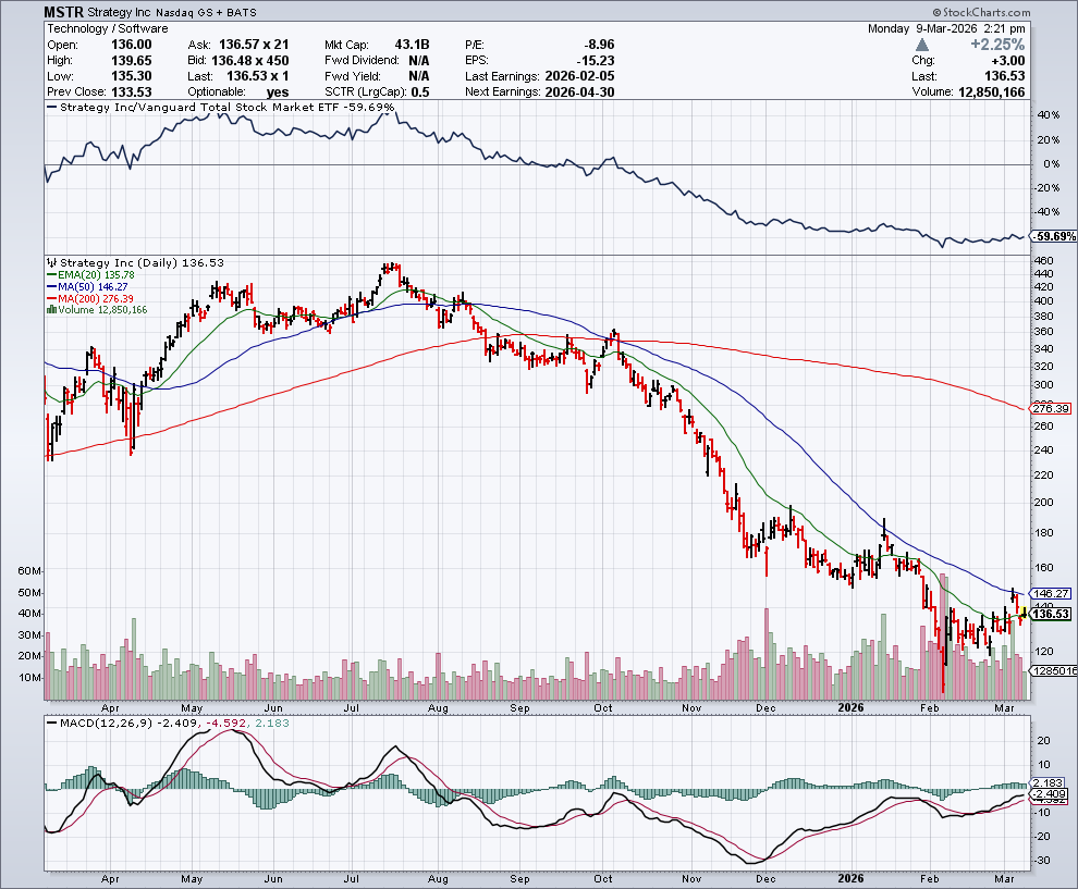 Strategy noteerde een verlies van 71% en heeft een markt-tot-netto activa verhouding van 0,99. Het aandeel van het bedrijf steeg vorige week 3,6%, maar sloot vrijdag 4,5% lager op $133,53.