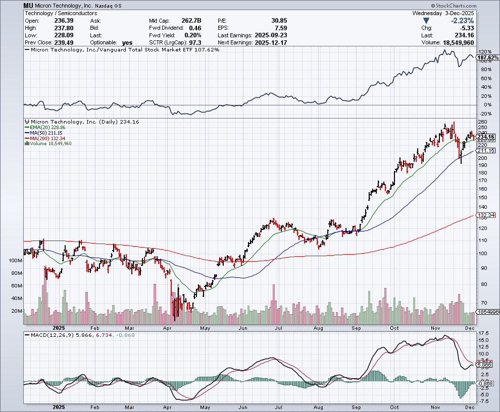 In de onderstaande grafiek zien we het koersverloop van Micron: