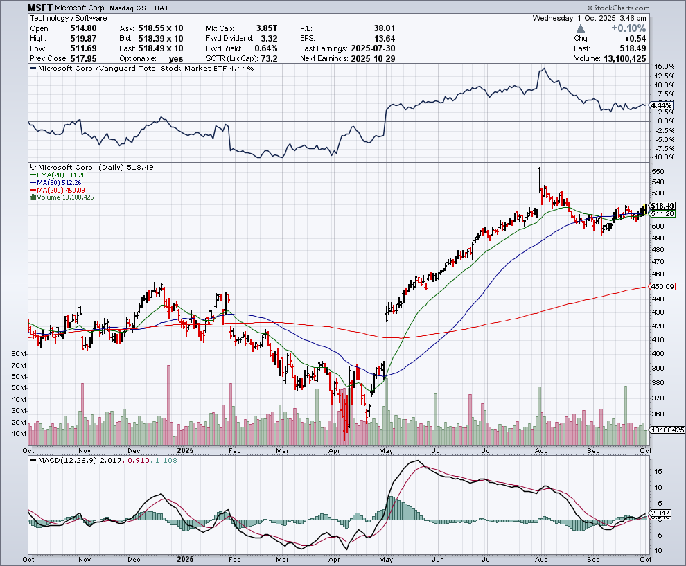 In de onderstaande grafiek zien we het koersverloop van Microsoft: