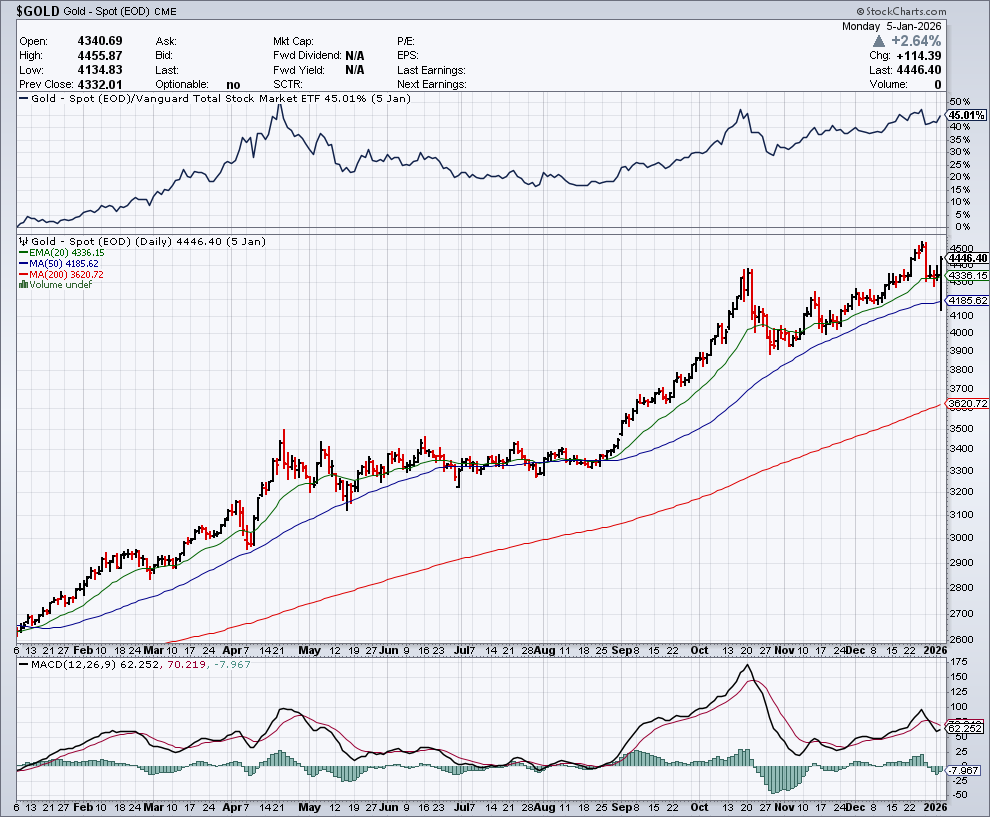 In 2025 bereikte goud een recordhoogte van $4.549 per ounce en steeg het jaar met 64%, het sterkste resultaat sinds 1979. In de onderstaande grafiek zien we het koersverloop van goud: