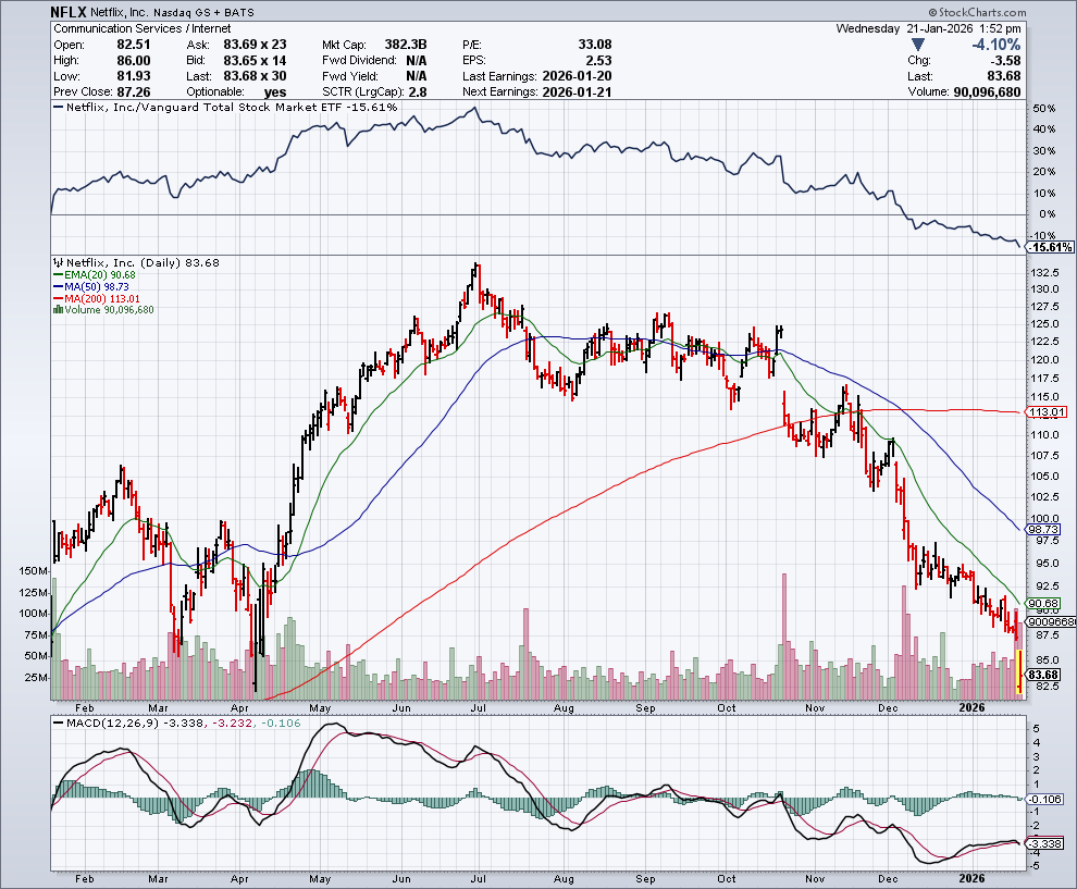 In de onderstaande grafiek zien we het koersverloop van Netflix, dat flink lager gleed: