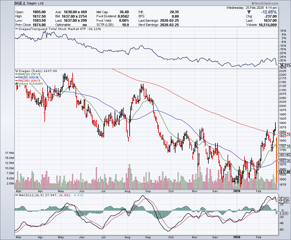 In de onderstaande grafiek zien we het koersverloop van Diageo, dat onderuit ging door het nieuws: