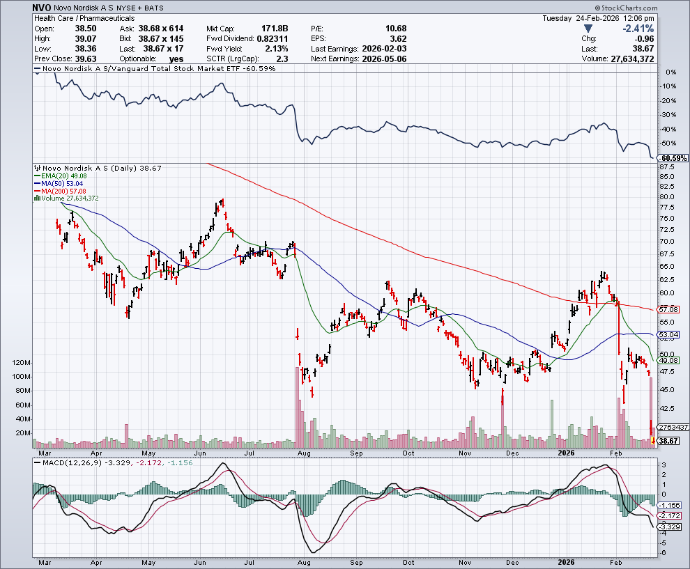 In de onderstaande grafiek zien we het koersverloop van Novo Nordisk, dat flink onderuit is gegaan: