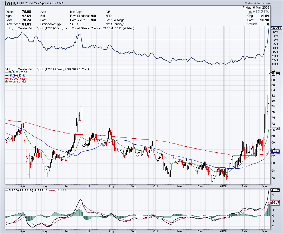 WTI steeg vorige week 36% naar $90,90 per vat, Brent noteerde $92,69, een enorme stijging ten opzichte van begin januari rond $60.