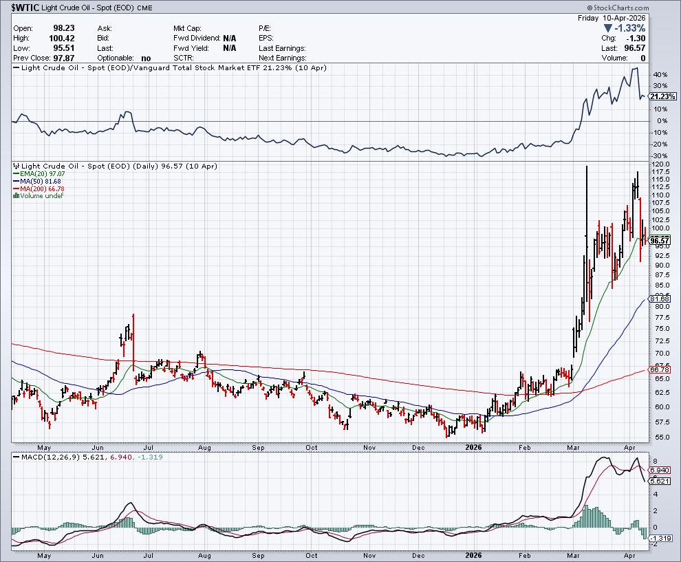De markt reageerde direct op de vrees voor verdere verstoring van de wereldwijde energievoorziening. In de onderstaande grafiek zien we het koersverloop van olie:
