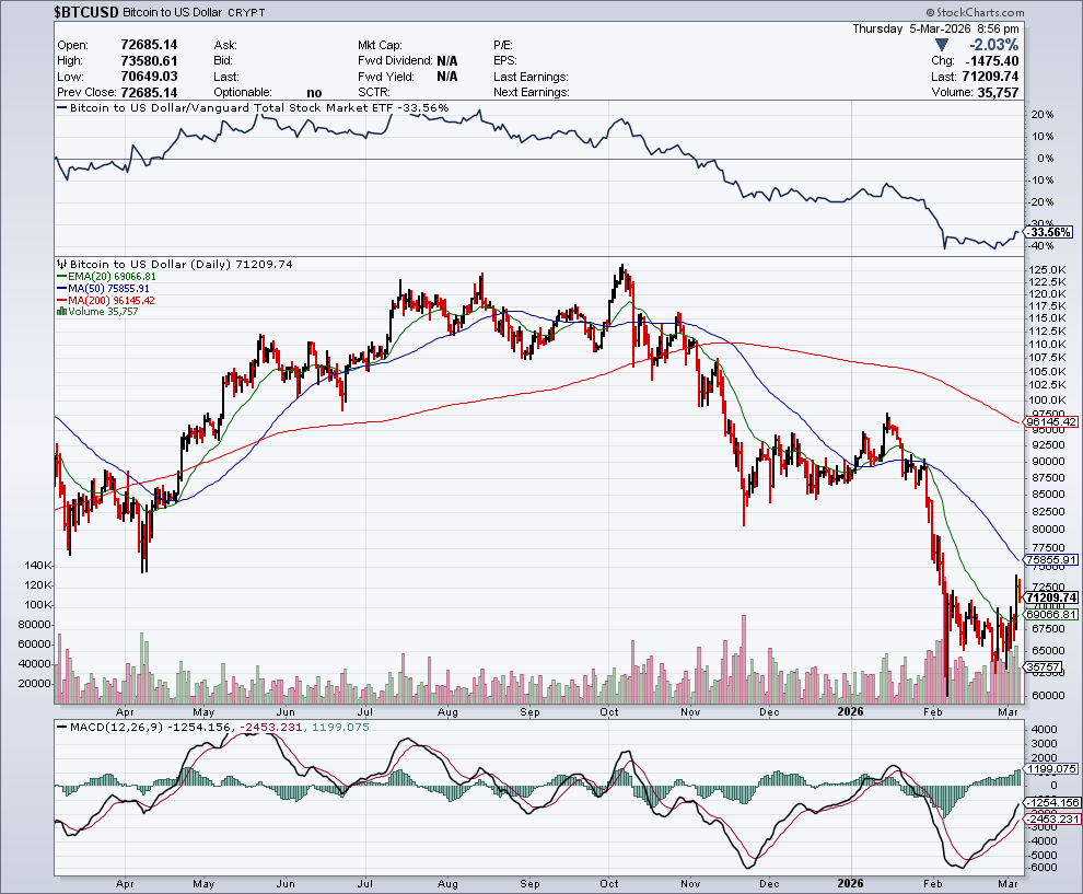 In de onderstaande grafiek zien we het koersverloop van Bitcoin, dat onlangs opveerde nadat meer beleggers het gingen zien als relatief veilige haven:
