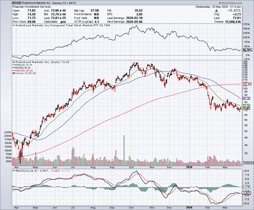 In de onderstaande grafiek zien we het koersverloop van Robinhood:
