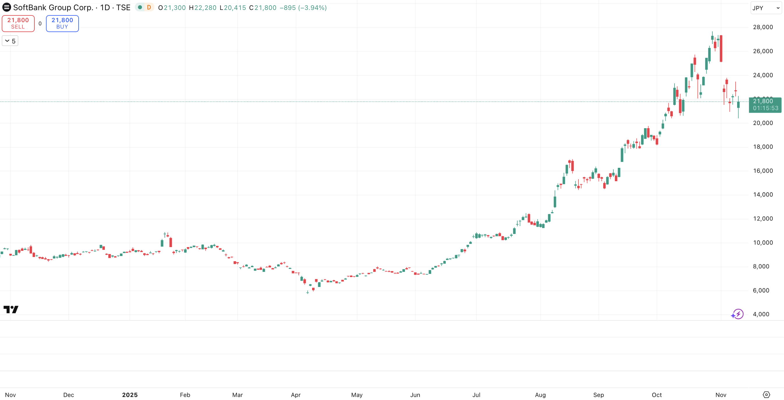 In de onderstaande grafiek is het koersverloop van SoftBank weergegeven: