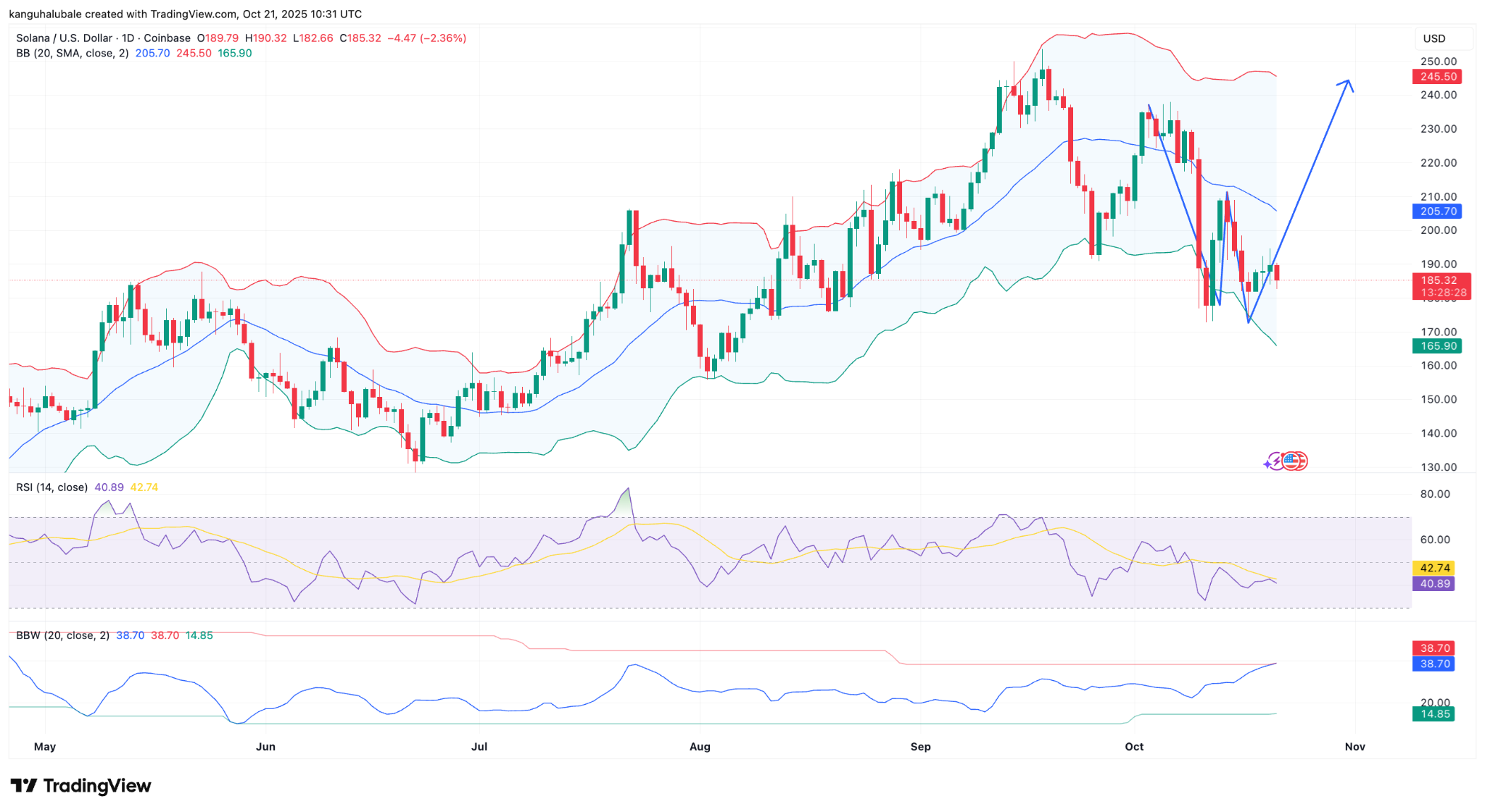 Solana vormde een dubbele bodem rond $172 en $174, een W-vormige structuur op de dagelijkse grafiek. Dit patroon kan de prijs eerst naar $210 en uiteindelijk naar $250 brengen: