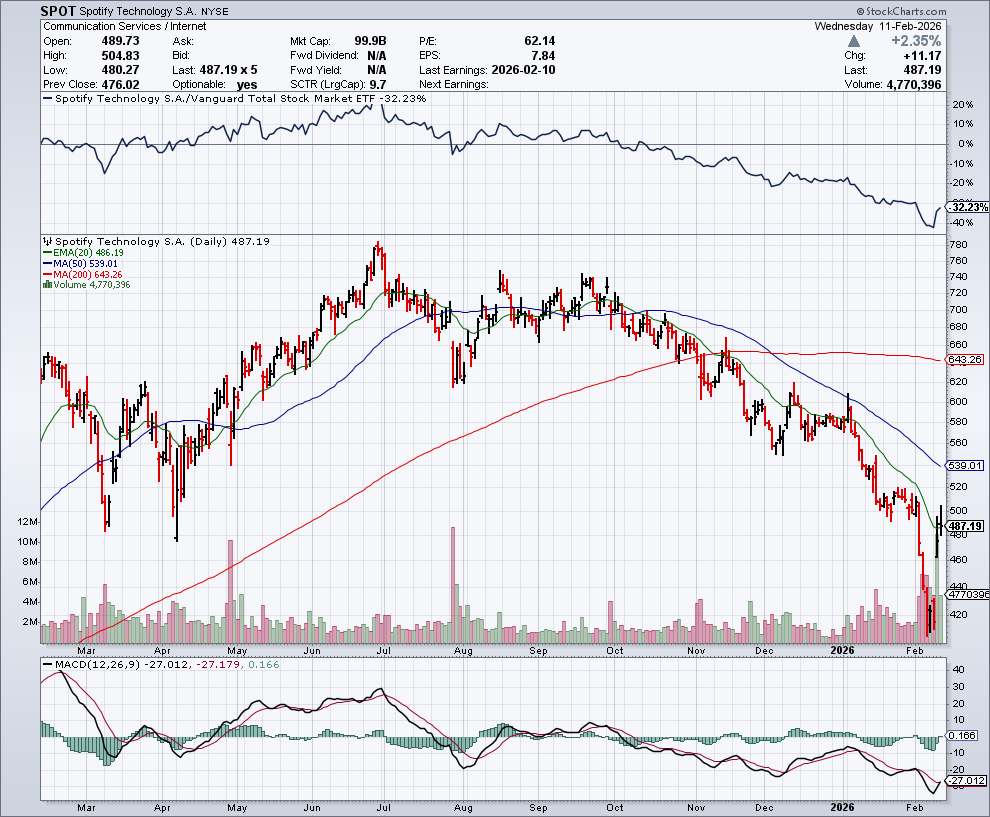 In de onderstaande grafiek zien we het koersverloop van Spotify: