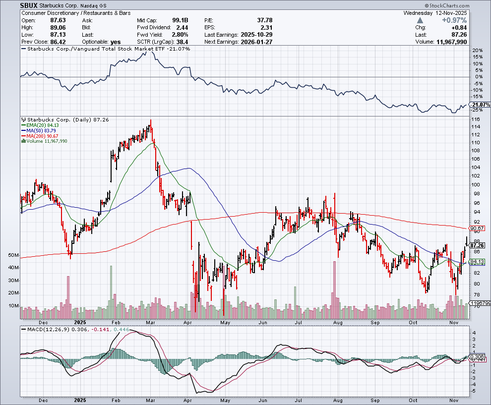 In de onderstaande grafiek zien we het koersverloop van Starbucks:
