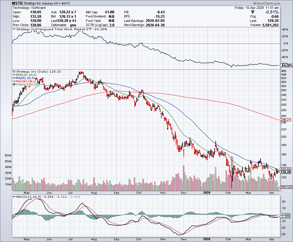 De bank blijft positief over de langetermijnstrategie van Strategy ondanks de lagere waardering. In de onderstaande grafiek zien we het koersverloop van Strategy: