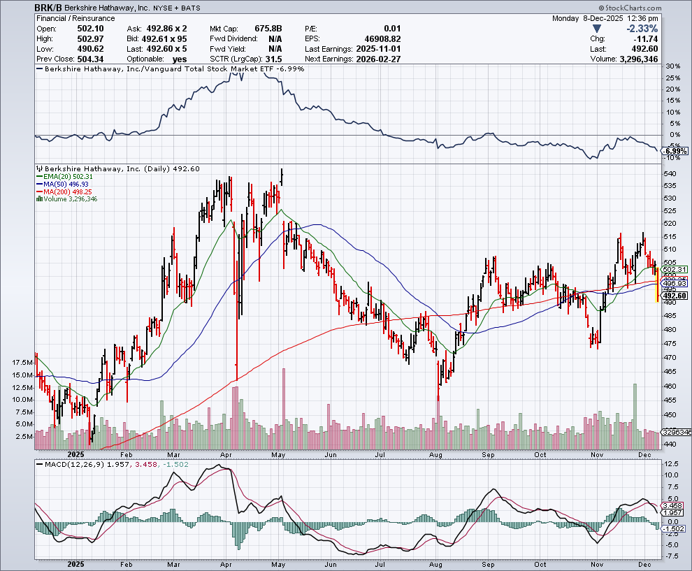 Beleggers maken zich zorgen over de koers van Berkshire na Buffett’s vertrek in 2026. De aandelen presteren dit jaar onder het S&P 500-gemiddelde, ondanks een stijging van 9 procent.