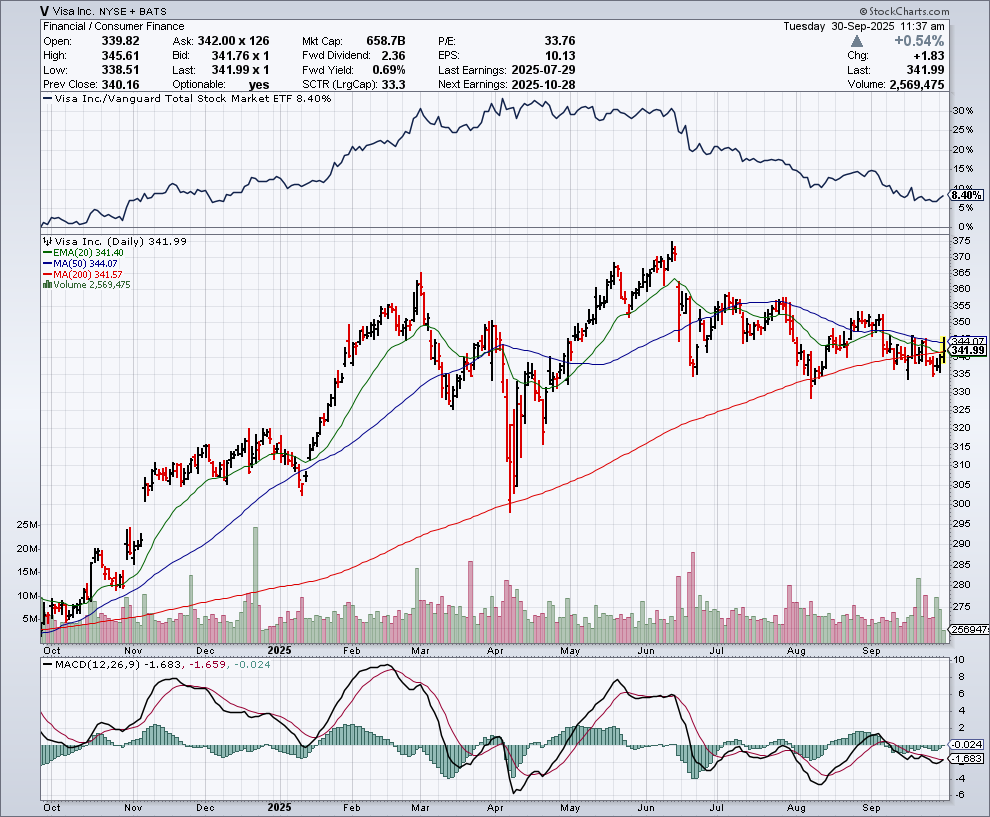 In de onderstaande grafiek zien we het koersverloop van Visa: