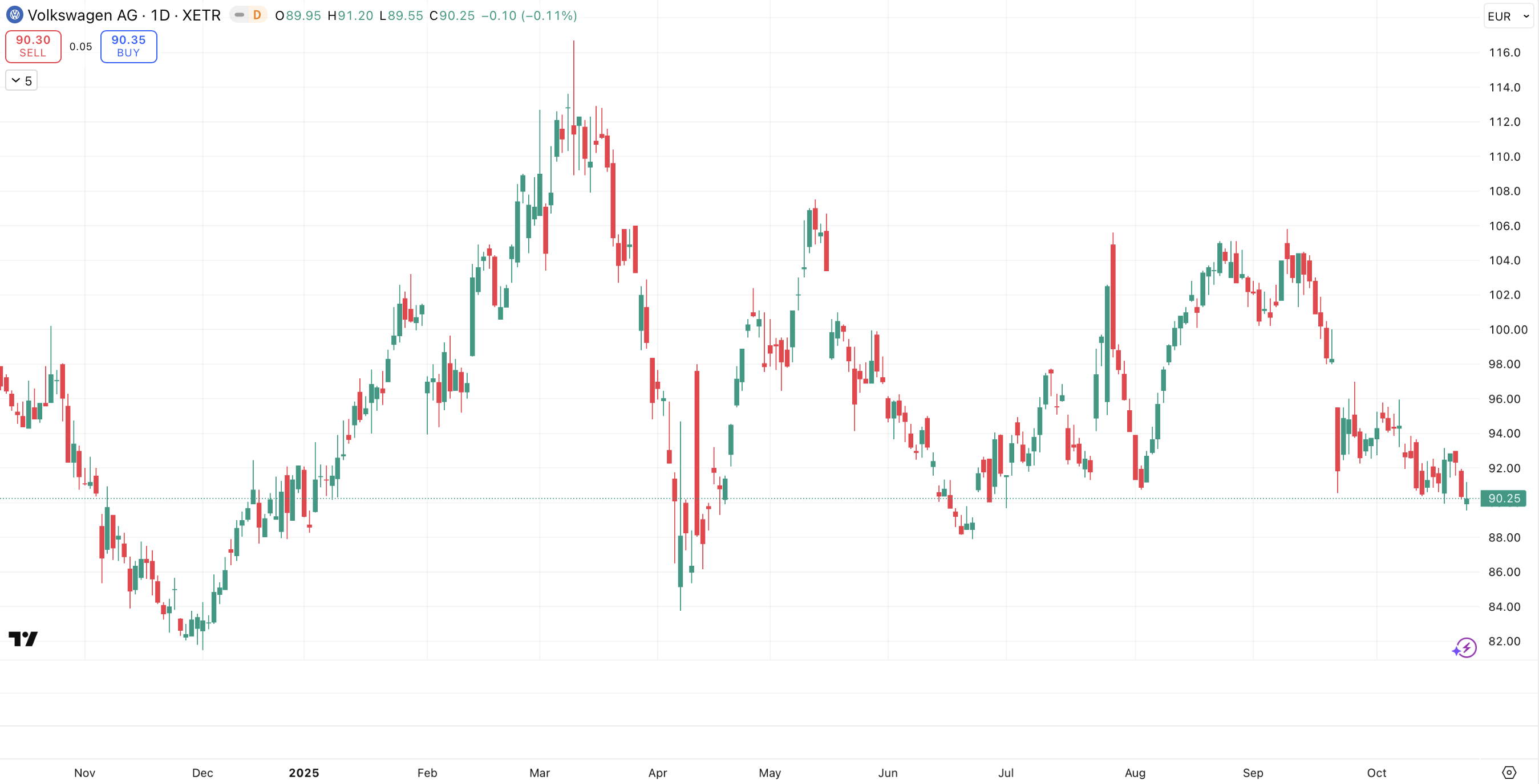 De aandelen van Volkswagen gleden woensdagmiddag lager. De Duitse autobranche vreest aanzienlijke productiebeperkingen als het chiptekort aanhoudt.