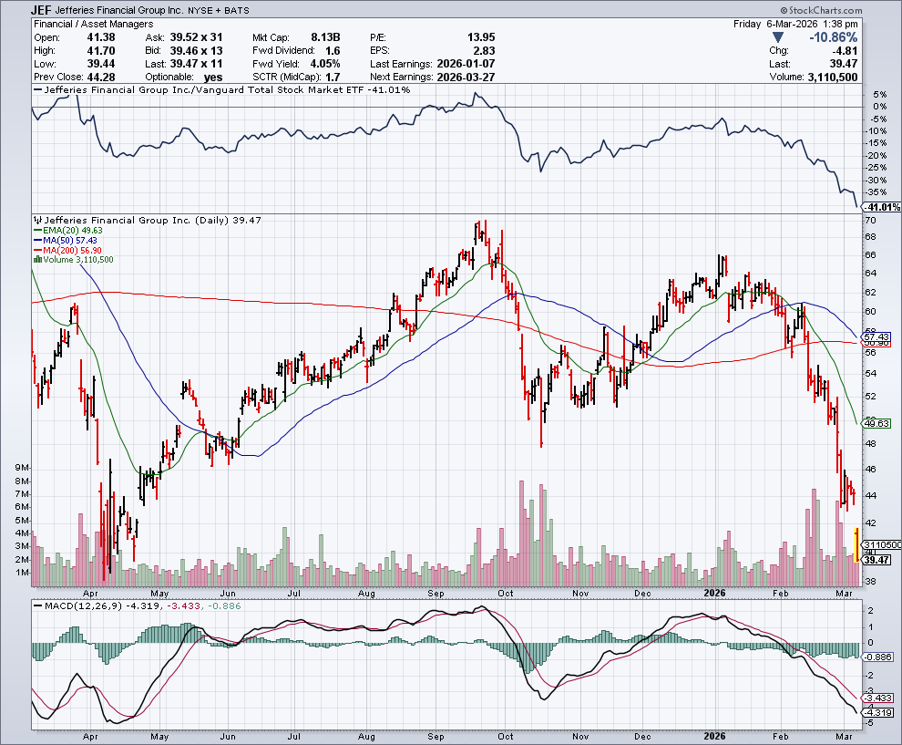 In de onderstaande grafiek zien we het koersverloop van Jefferies:
