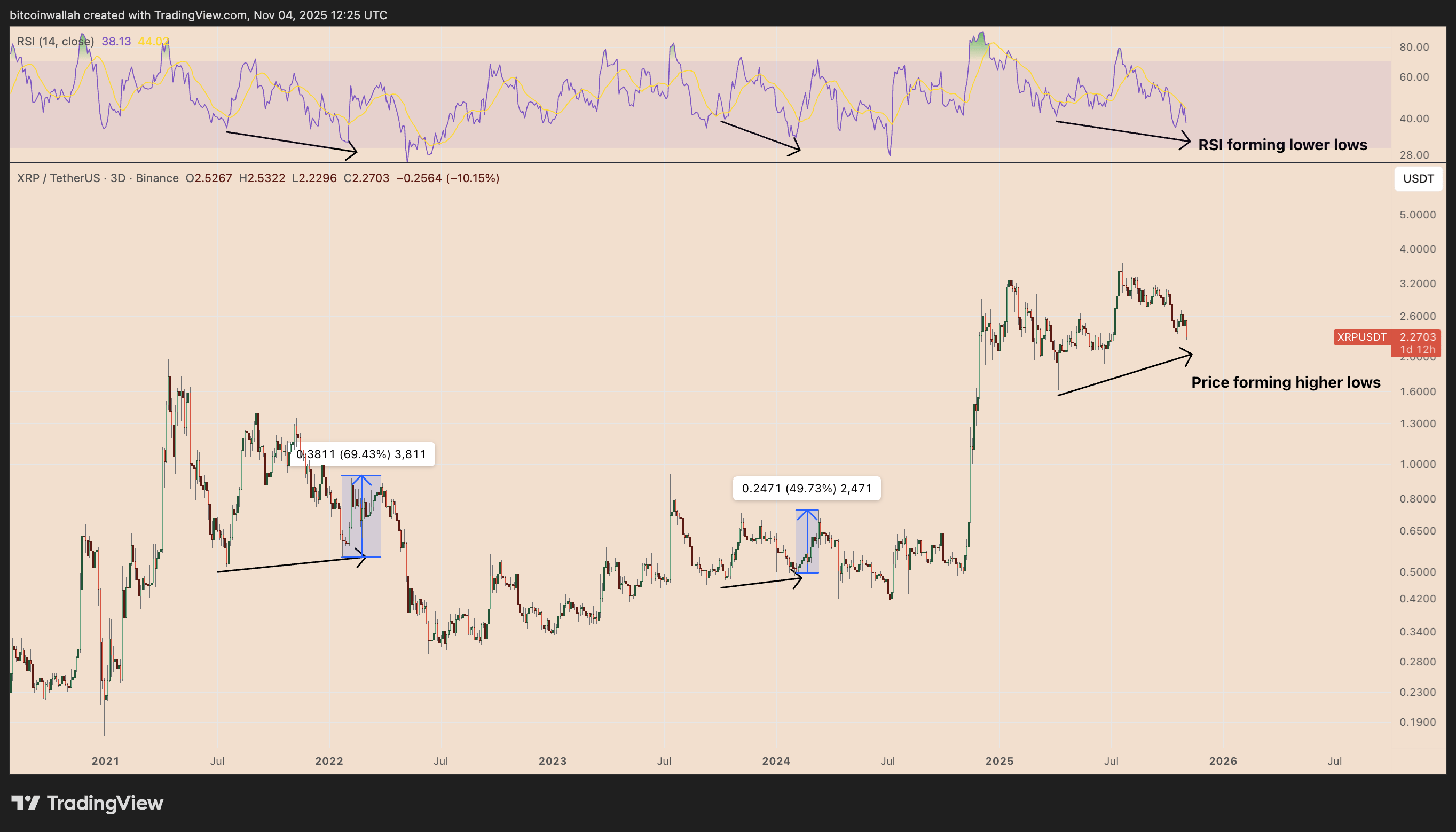 XRP vormt hogere lows terwijl de RSI lagere lows toont, een signaal van verzwakte neerwaartse druk. Historisch leidde dit patroon tot snelle prijsrallies van 49% tot 69%.