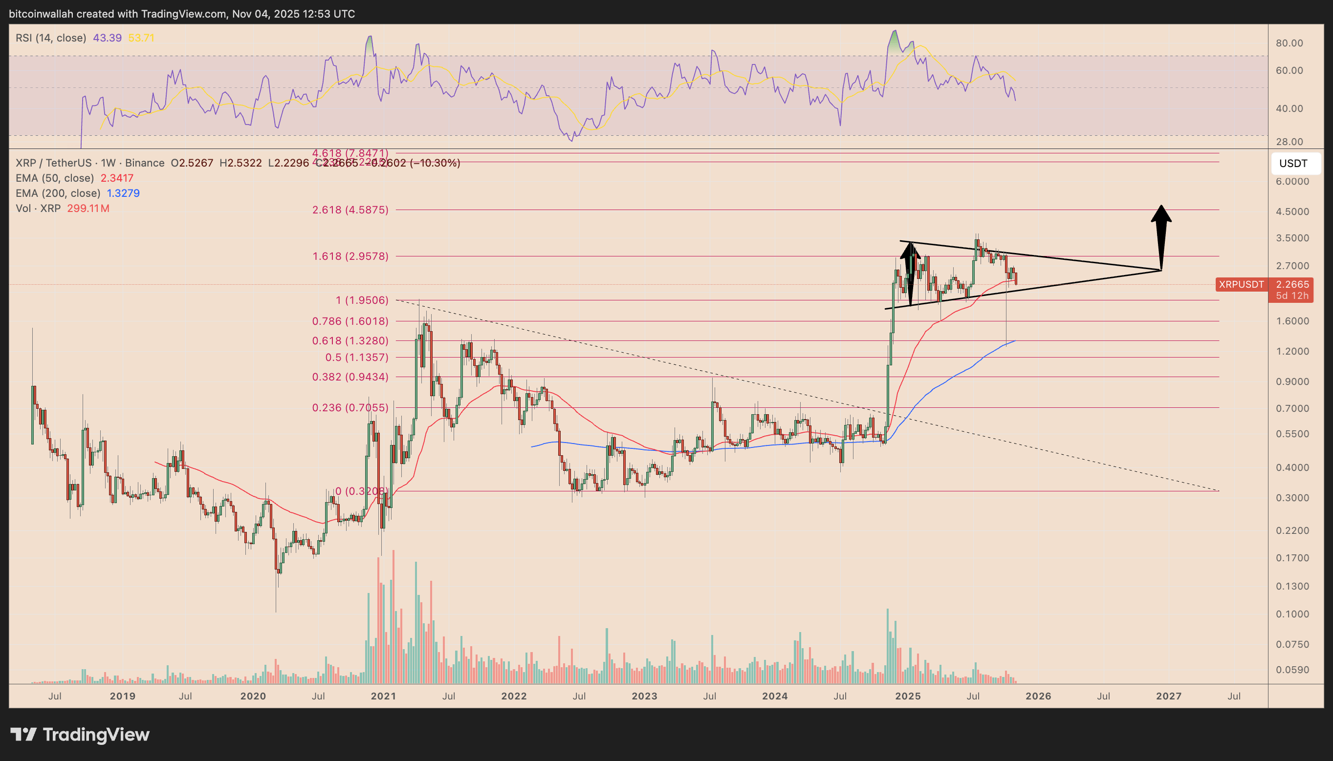 De symmetrische driehoek en Fibonacci-trendlijn versterken het bouncepotentieel. Een doorbraak uit deze structuur kan het prijsdoel van $5 activeren, een potentiële winst van circa 115%.