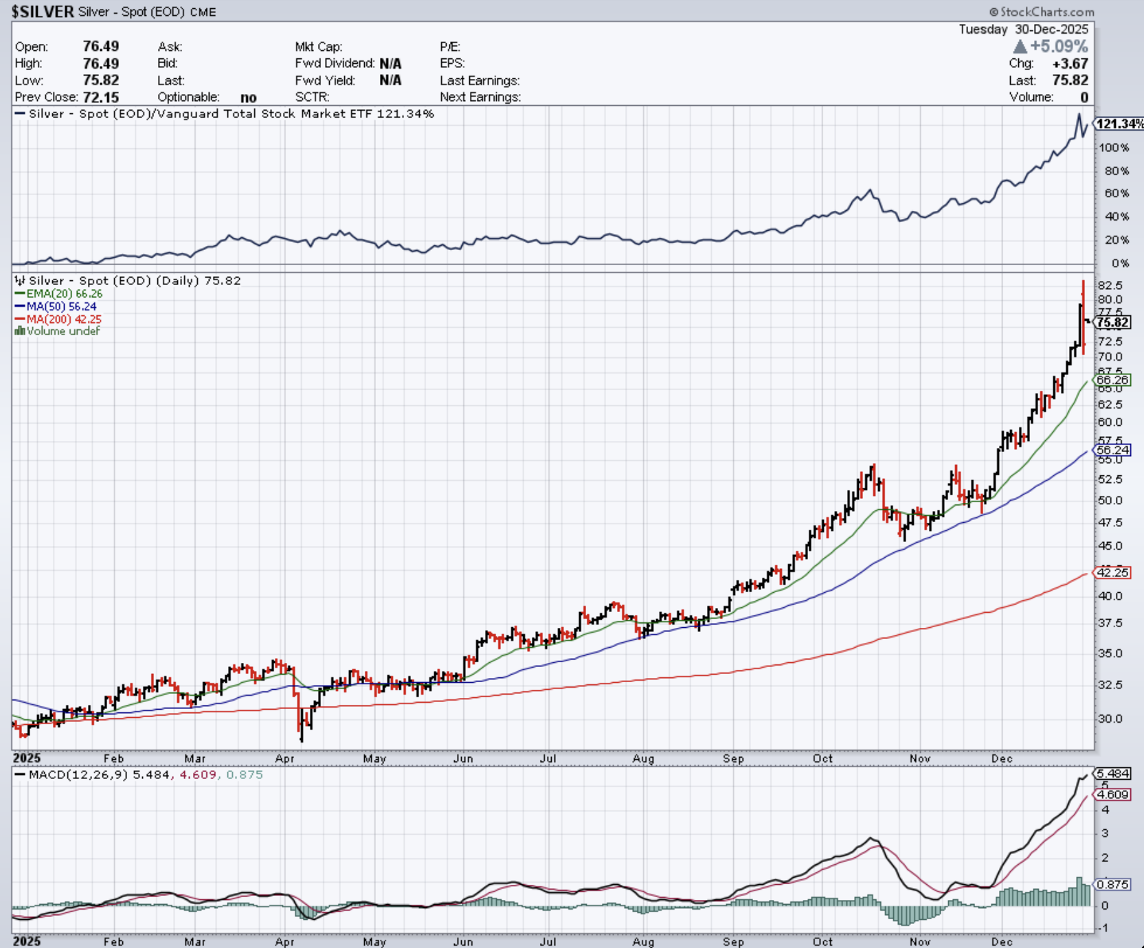 Zilver steeg maandag naar $80 per ounce, maar daalde later 8,7% in één dag. Dinsdag herstelde het metaal 7% tot $75,54, wat het jaarrendement op 158% brengt.